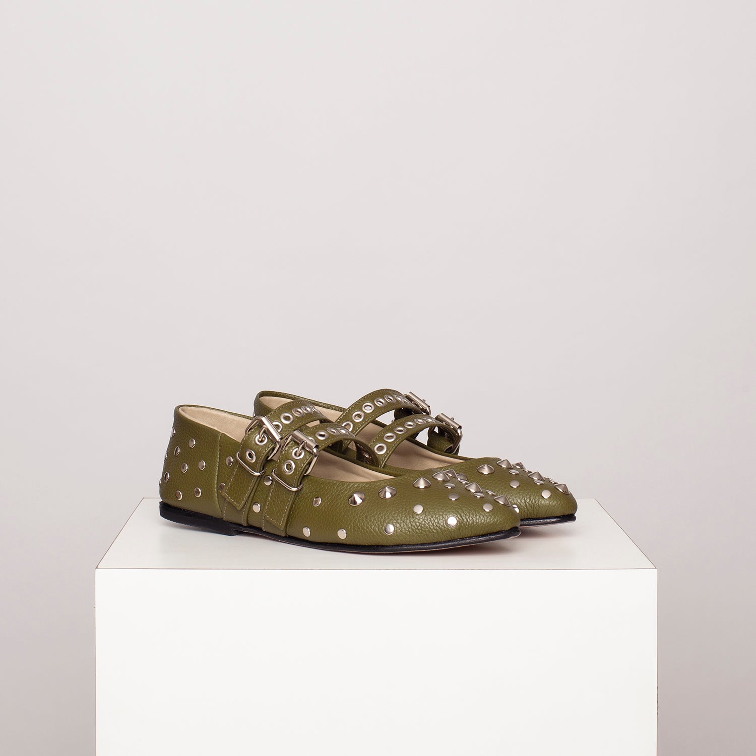 ballerina con dos correas, tachas, hebillas y cinta opcional en el tobillo confeccionada en chile con cuero natural.